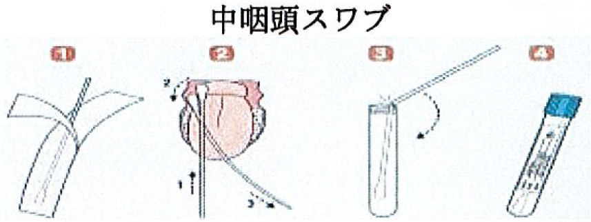 - 鼻腔/口腔を事前に洗浄し、舌根を横切って咽頭後壁、扁桃腺窩、側壁などをスワブし、粘膜細胞を収集するために3~5回繰り返し拭きます。